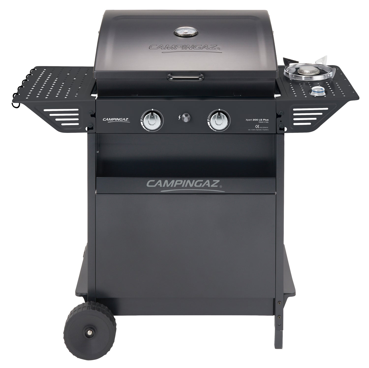 BBQ Campingaz Made in Italy, potenza 8,2+2,1 kW, alimentazione GPL con sistema roccia lavica, dimensioni superficie cottura 54,5 x 34,5 cm, materiale superficie di cottura ghisa smaltata, griglia articolata 54x13,5 cm, accensione piezo, coperchio forno con indicatore di temperatura, frontale porta spezie, ripiano laterale pieghevole, 2 ruote fisse, 2 bruciatori in acciaio. Telo di copertura Classic S (non incluso). Dimensioni chiuso 92,5x50x99 cm. Peso 22,5 kg.