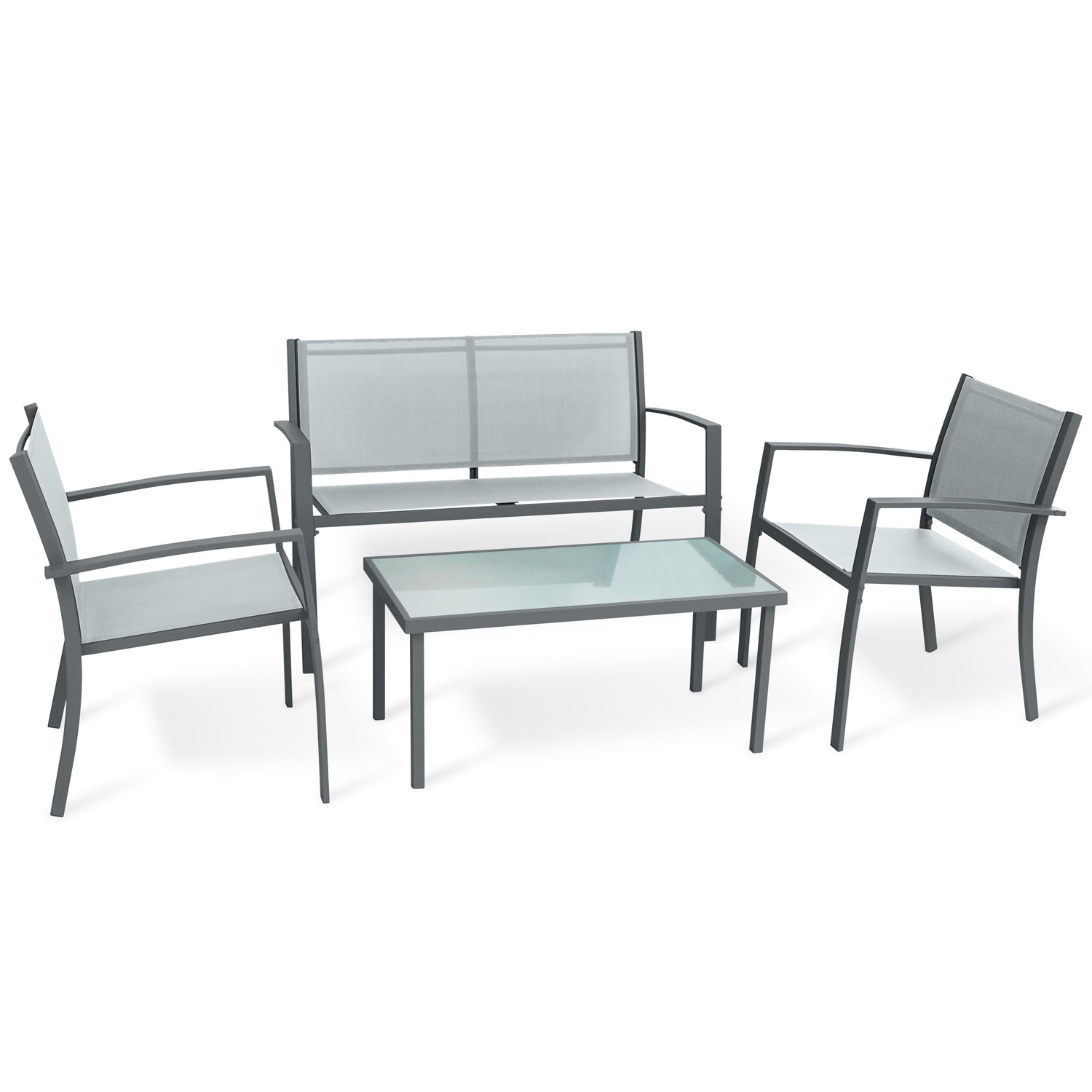 Struttura in acciaio verniciato.Seduta e schienale in textilene.Tavolino con piano in vetro temperato spessore 5 mm.Composto da: divano 110 x 58 x h 75 cm, 2 poltrone 58 x 58 x h 75 cm, tavolino 84 x 44 x h 38 cm.Colore grigio