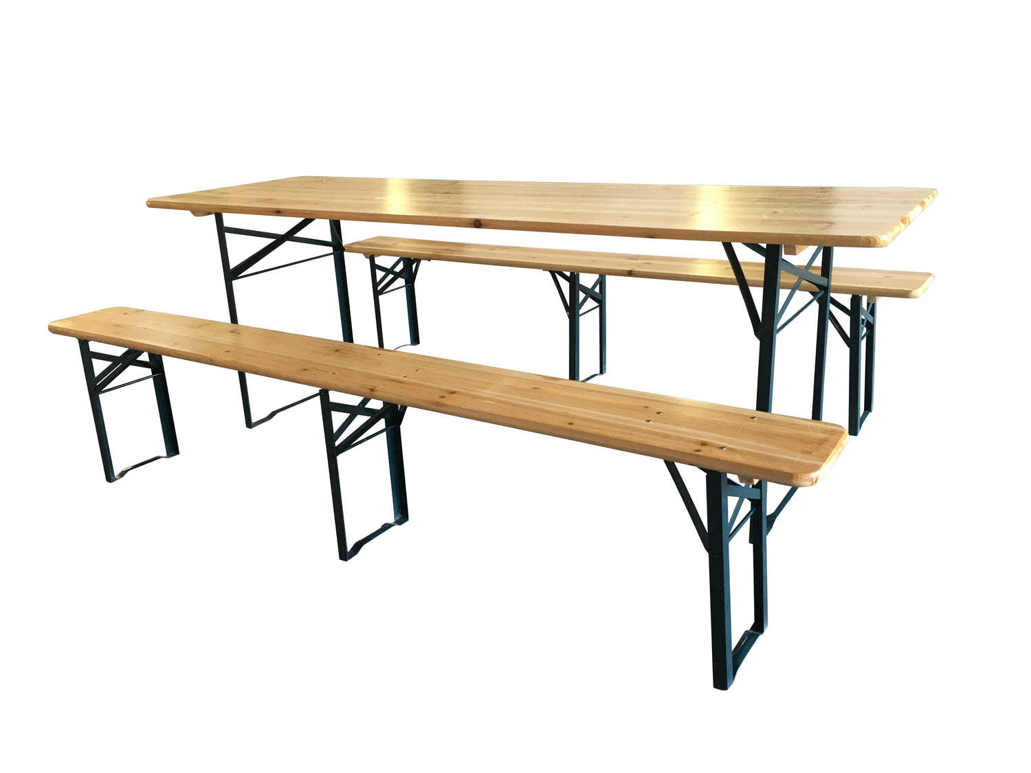 Struttura in acciaio verniciato, piano tavolo e panche in legno massello verniciato spessore 25 mm, pieghevoli. Tavolo dimensioni cm 220x70x76h due panche dimensioni cm 220x30