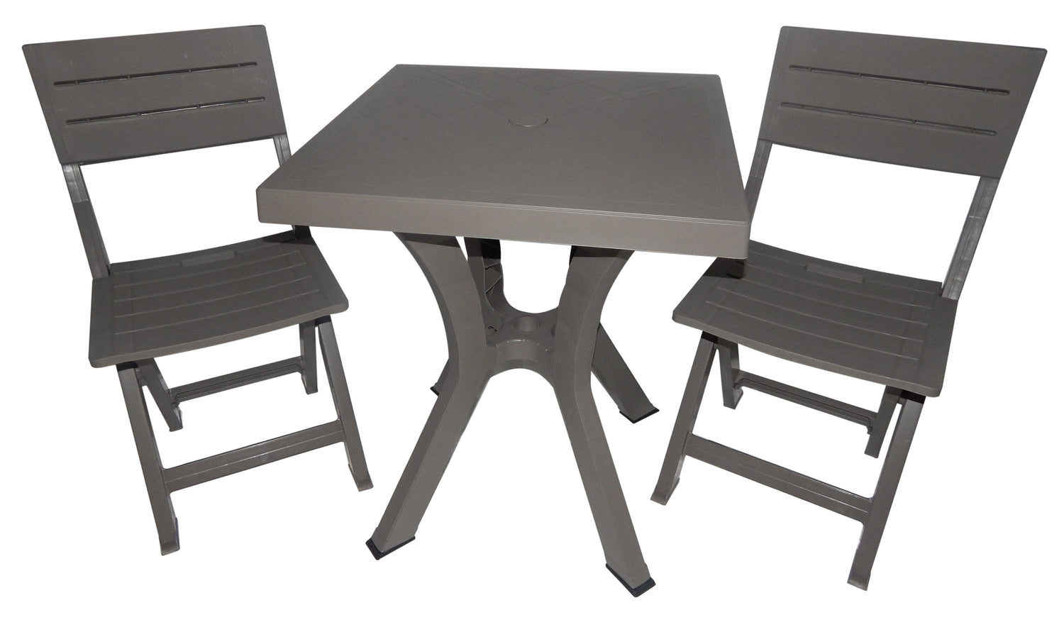 in resina antiurto. Composto da: tavolo con incrocio. due sedie pieghevoli Dimensioni tavolo cm 60x60x70h Dimensioni sedia cm 39x43x80h Colore tortora