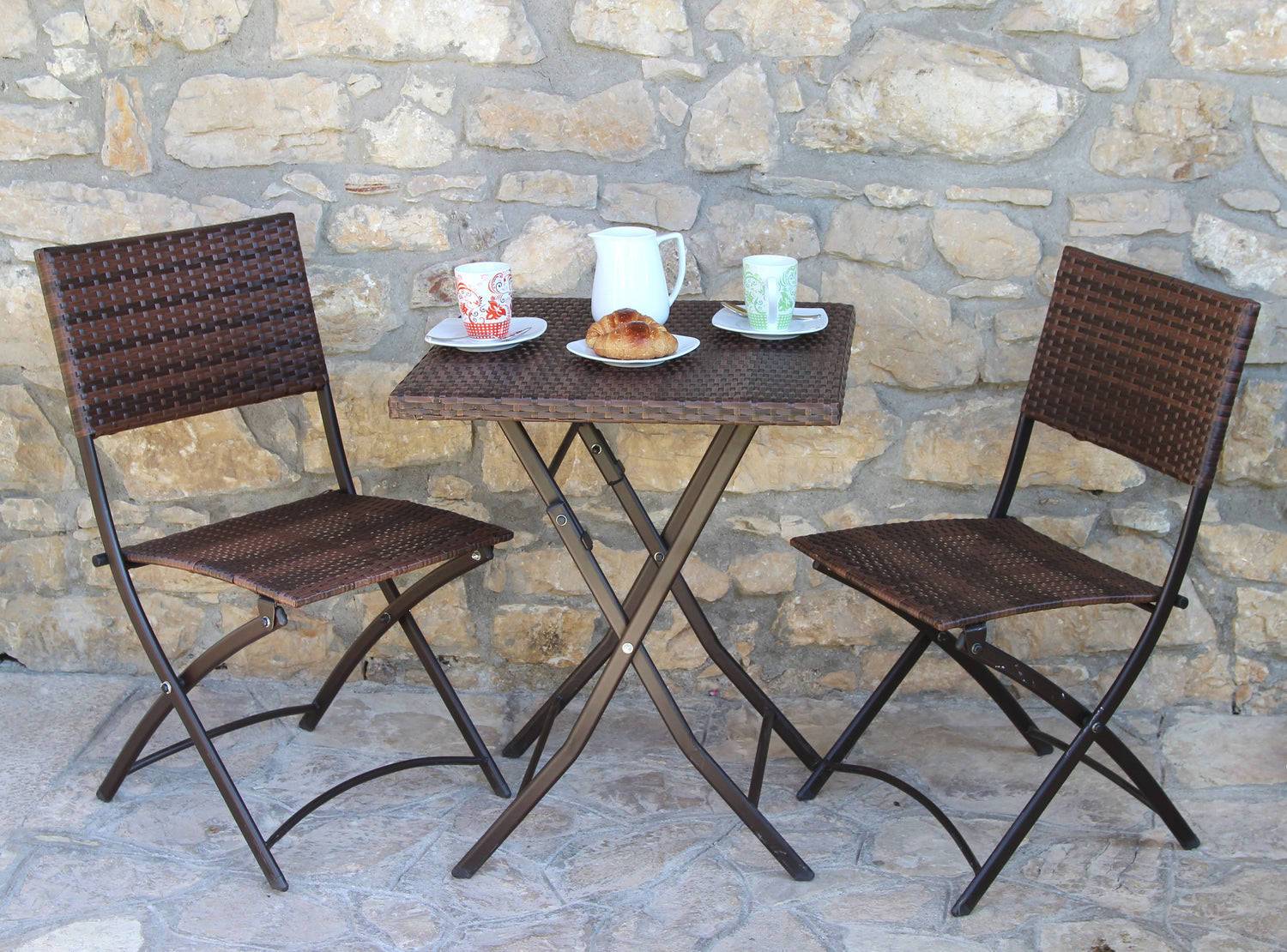 struttura in acciaio verniciato, piano tavolo e sedute in polirattan. Pieghevole. Composto da: tavolino cm 60x60x72h due sedie cm 46x55x81h