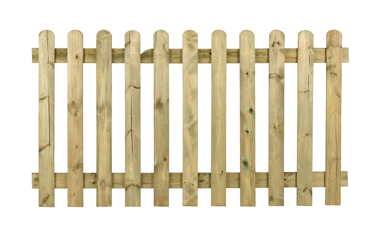 realizzato in legno di conifera impregnato in autoclave color verde naturale dotato di 11 assi verticali da 9X1,5 cm con interasse da 7,5 cm arrotondate superiormente. Dimensioni 180 x h 100 cm.