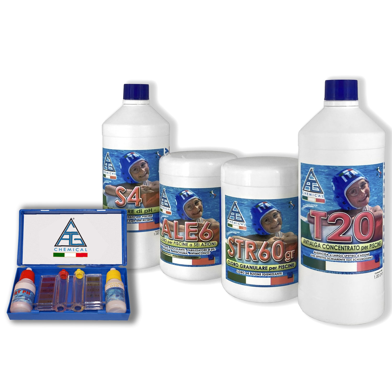 ideale per le piccole piscine.Composto da:- antialghe Confezione da 1 l- cloro 6 azioni Confezione da 1 kg- cloro in polvere Confezione da 1 kg- correttore di pH- Confezione da 1 kg- minikit per la misurazione del cloro e del pH