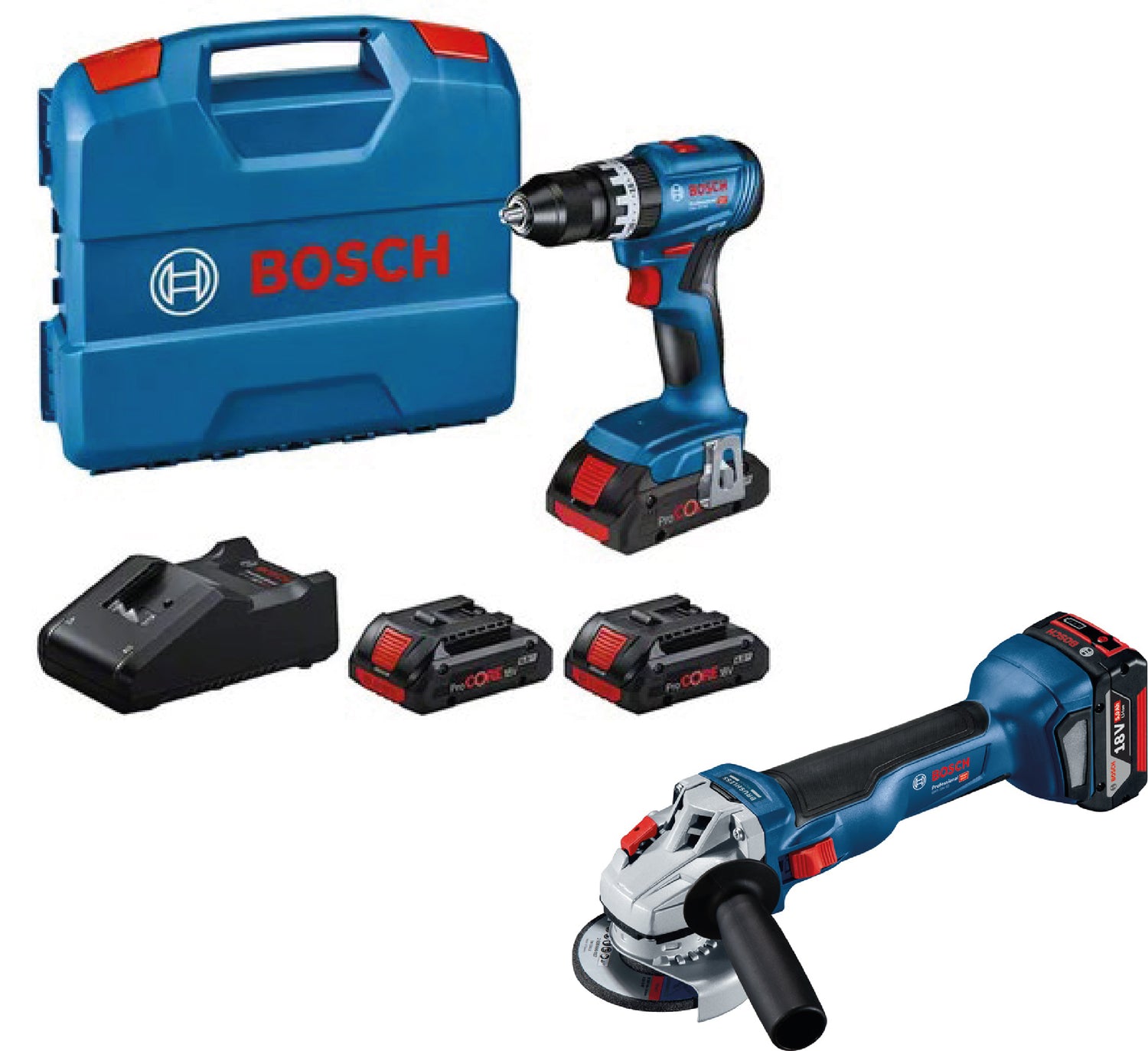 Trapano GSB 18V-45 a percussione 45 Nm (nudo)+ smerigliatrice GWS 18V-10 D.115 mm (nudo)+ set ricarica 3 batterie proCORE 4Ah con caricabatterie