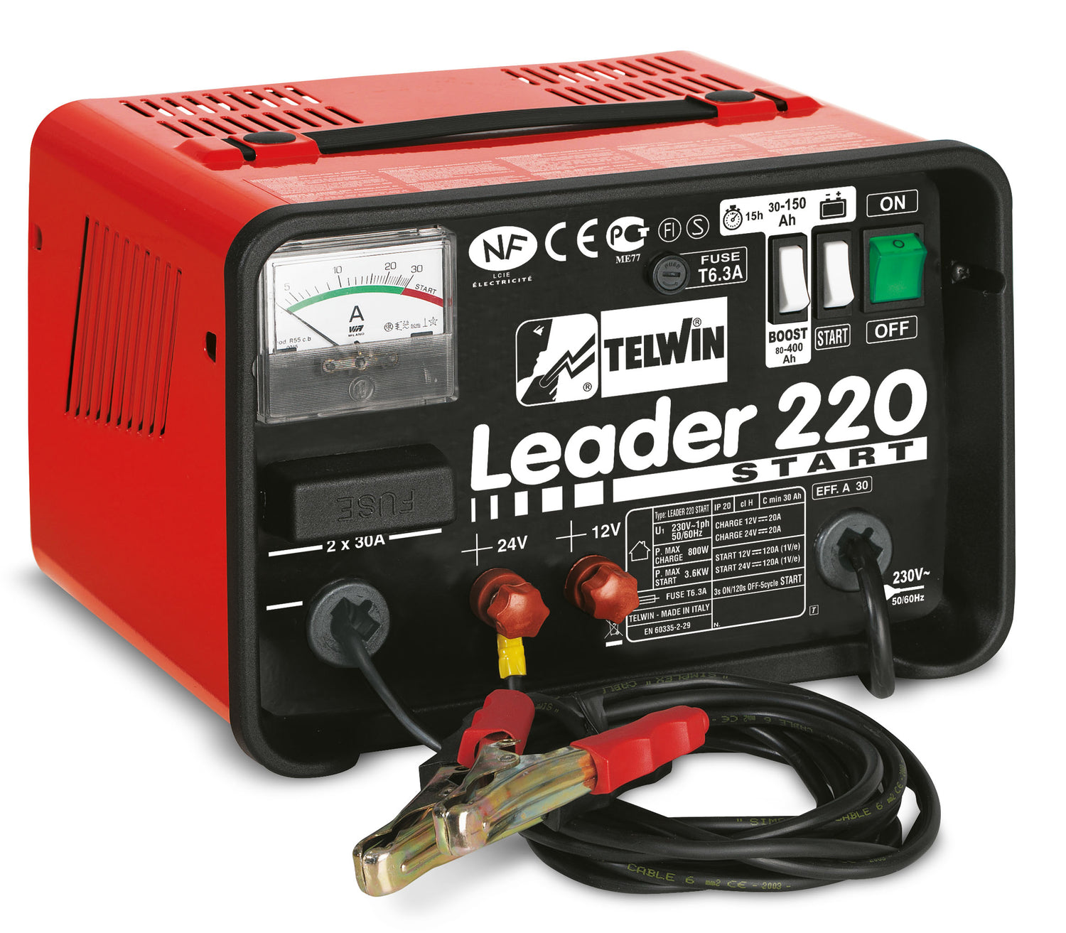 Mod. LEADER 220 START per la carica di accumulatori e l'avviamento rapido di qualsiasi tipo di auto con motore a benzina. Selezione carica normale, carica rapida (BOOST), avviamento rapido. Dotato di protezione contro sovraccarichi ed inversioni di polarità. Amperometro per l'indicazione della corrente di carico e di avviamento. Batteria 12-24 V. Corrente di carica max 20 A. Dimensioni 225 x 290 x h 205 mm. Peso 9,0 kg.