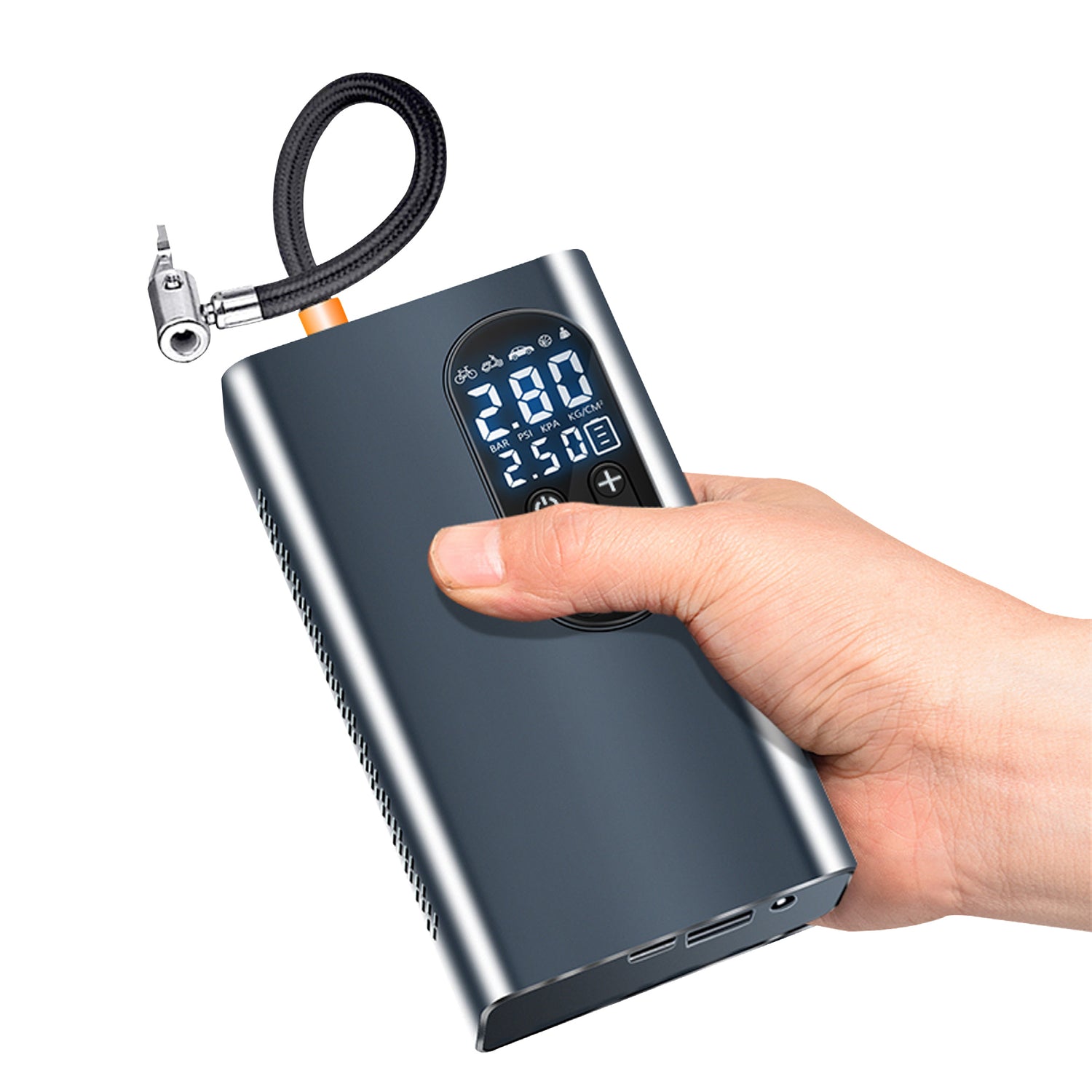 Compressore pressione da 0,2 a 10 bar pu operare con auto, motociclette, biciclette, palloni e molto altro. sistema anti surriscaldamento funzione powerbank e torcia comodamente ricaricabilespecifiche tecniche dimensioni imballo 200x130x66 mm tensione nominale cc 12 V/7,4 V potenza nominale 80 W corrente massima 7,5 A lunghezza cavo/usb 300 cm / 50 cm