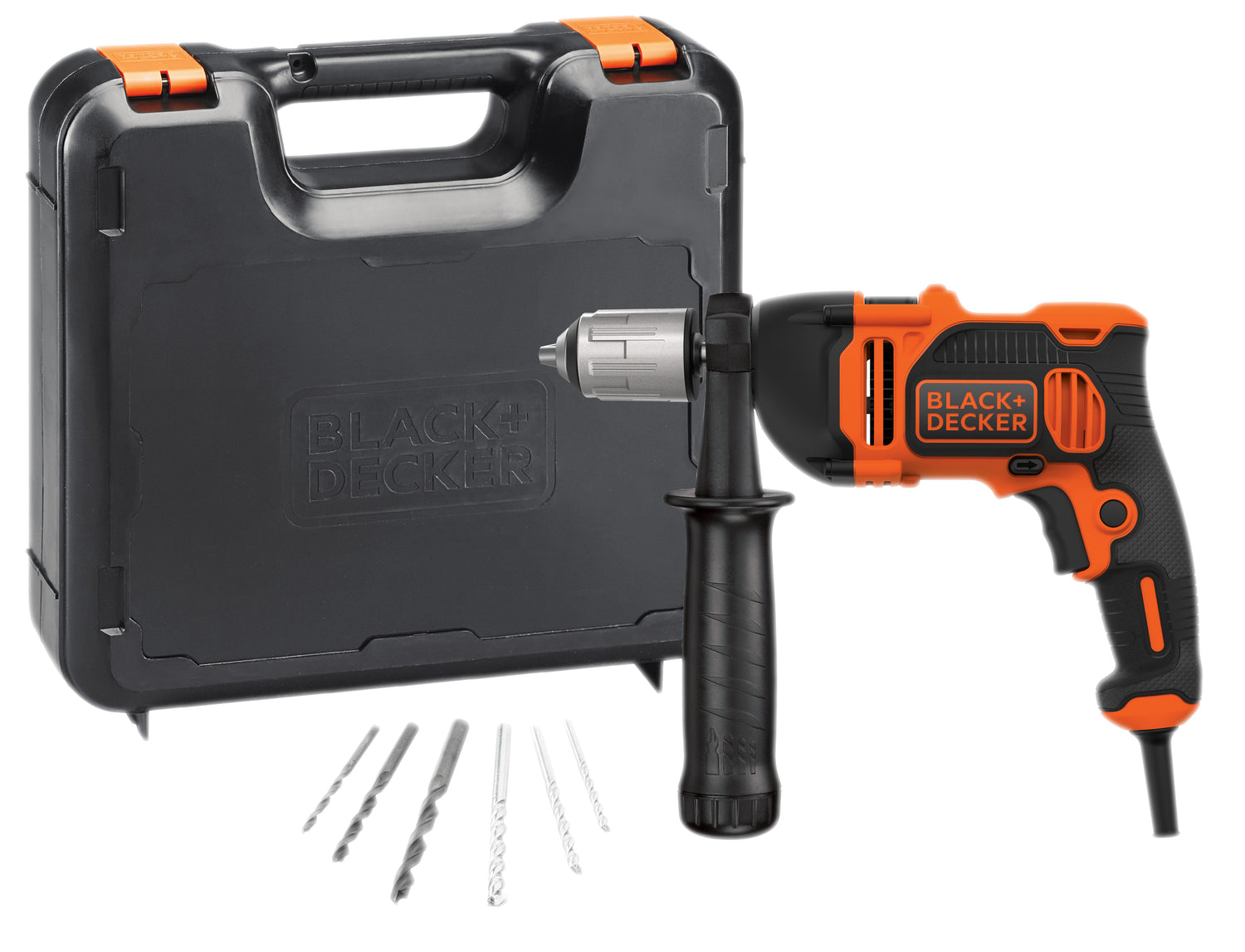 Mod. BEH850K Potenza 850 W - 230V - 50 Hz. Velocità a vuoto 0÷3.100 giri/min. Percussioni 54.400 colpi/min. Coppia di serraggio 26,6 Nm . Mandrino autoserrante 13 mm. Foratura legno 32 mm. Foratura metallo 13 mm. Foratura muratura 16 mm. Reversibile. Lunghezza cavo 3 m. In valigetta con impugnatura laterale e 6 punte