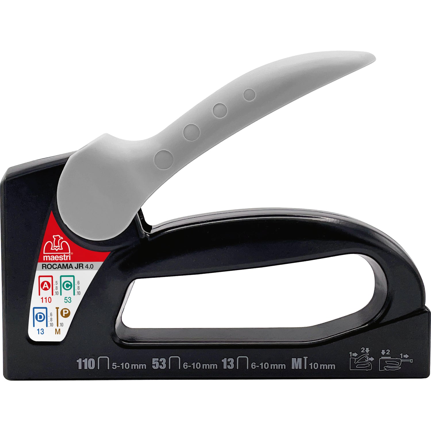 Mod. ROCAMA JR 4.0 Mod.110 corpo in lega speciale di alluminio. Caricamento sotto banchina. Disinceppo rapido. Per punti con passo 11,2 mm e altezza 5÷10 mm Monta punti 105 - 108 - 110 Peso 350 g