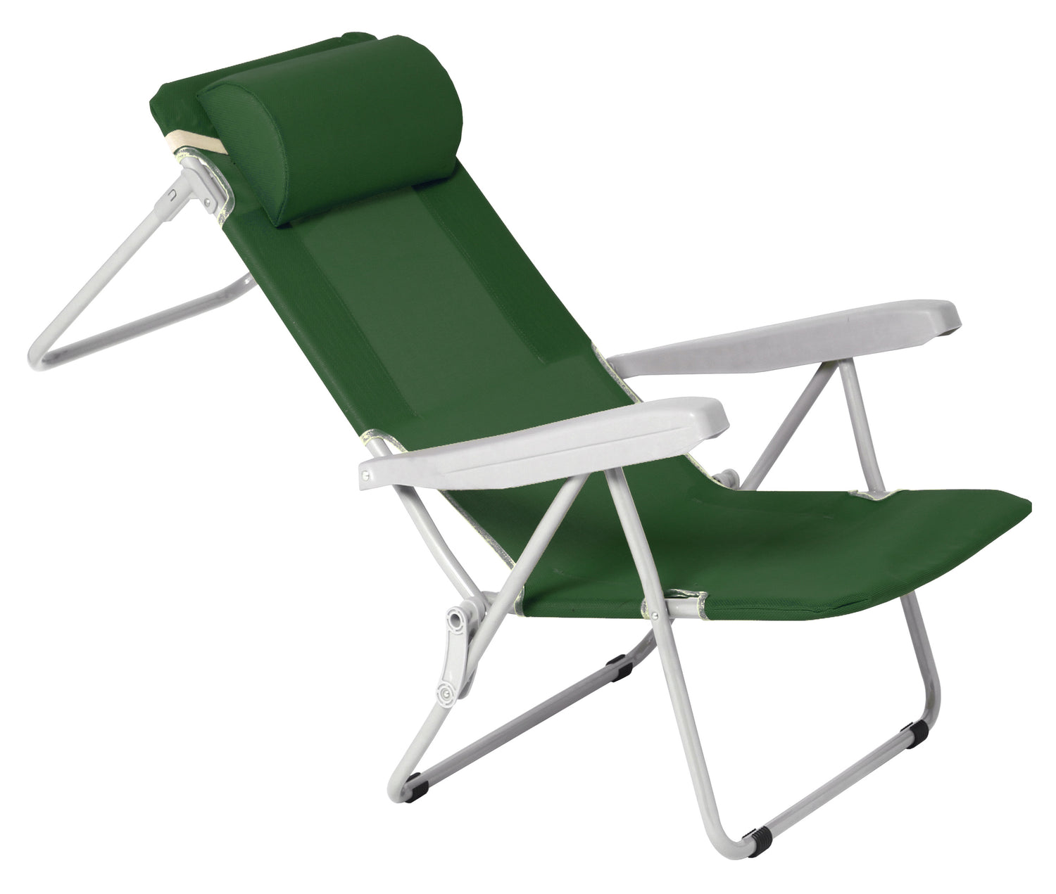 struttura in tubolare di acciaio ø 20 mm Cuscino Oxford spessore 4 cm Braccioli antinfortunistica. Regolabile in 6+1 posizioni Funzione letto. Colore verde