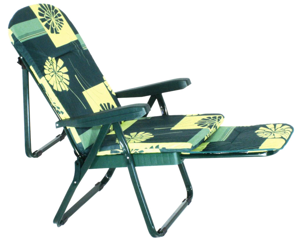 struttura in tubolare di acciaio mm 35x20 Cuscino in policotone spessore 4 cm Braccioli antinfortunistica. Poggiapiedi con carrello. Regolabile in 6+1 posizioni. Funzione letto
