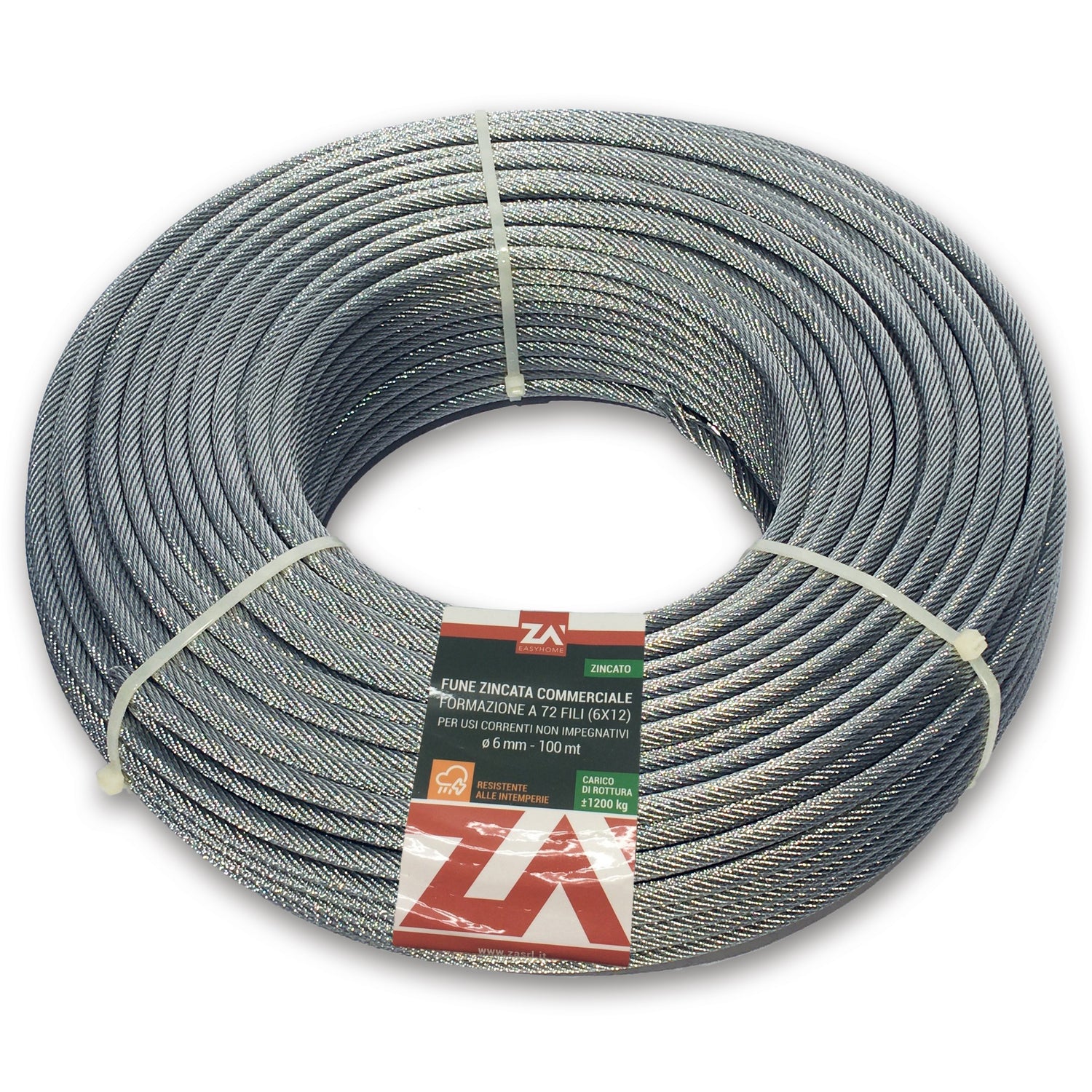 in filo di acciaio zincato. Antigirevole. Certificata. Adatto per gru edili e portuali, carichi non guidati. Diametro 4 mm. Rotolo da 100 mt