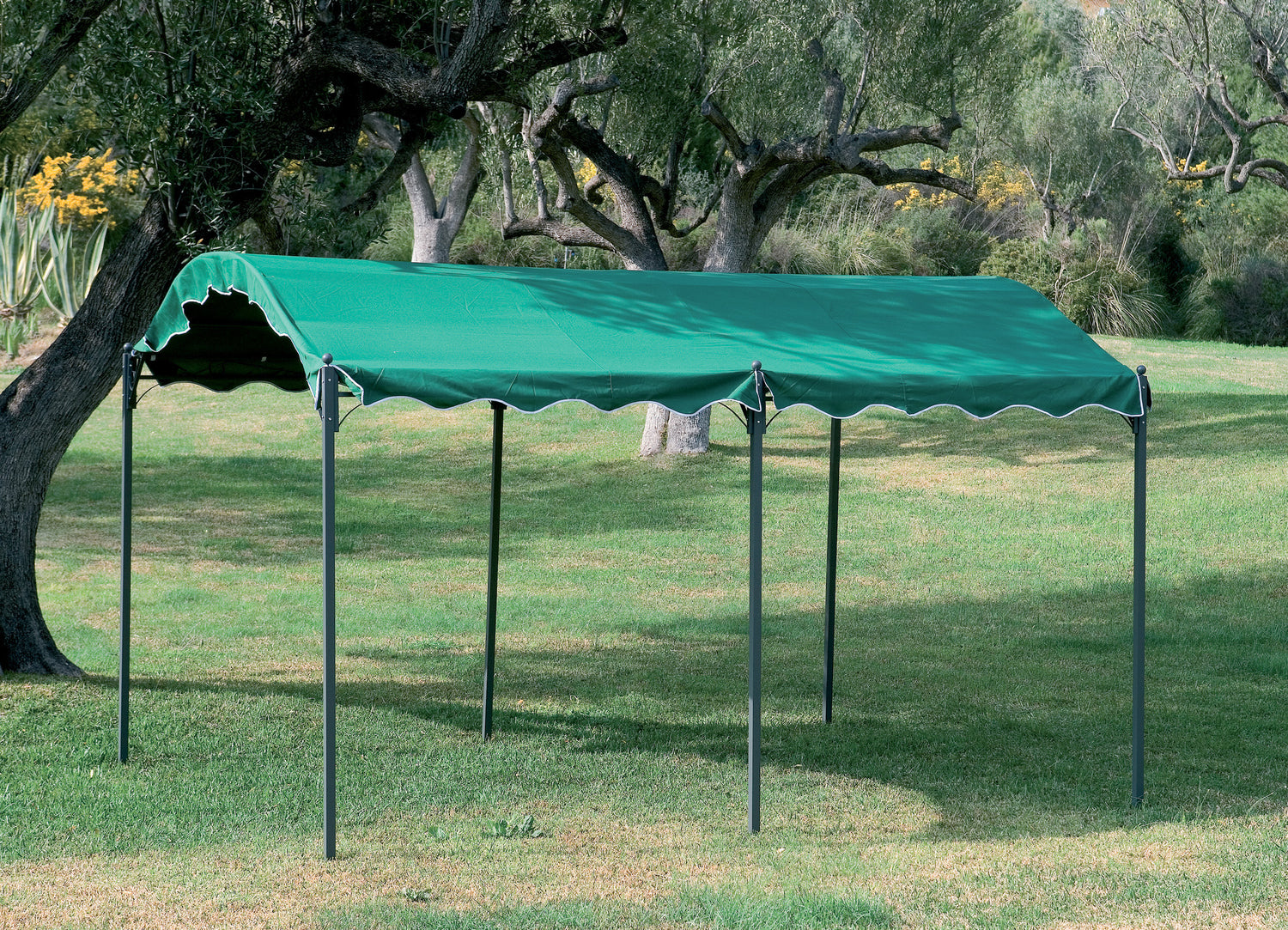 ~ struttura in acciaio verniciato a polveri epossidiche~ pali portanti ø 40 mm, tubi di collegamento ø 20 mm~ top verde in poliestere 180 g/mq