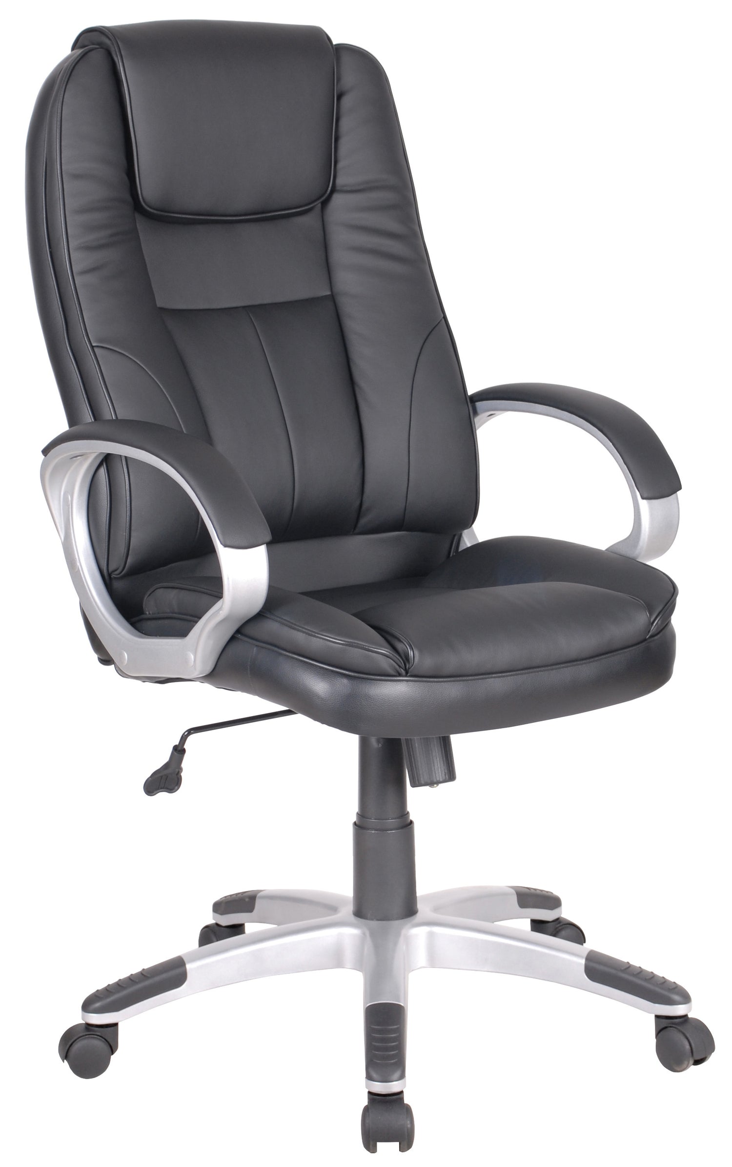 Elegante poltrona direzionale imbottita Mod. 1426 dotata di ampia seduta e di schienale ergonomico reclinabile in PU e braccioli. Meccanismo oscillante con cui lo schienale può essere bloccato in posizione verticale o inclinato. Pistone con elevazione a gas permette la regolazione dell'altezza della seduta soddisfacendo qualsiasi tipo di esigenza. La base in nylon a cinque razze garantisce un eccellente stabilità alla sedia e le ruote antigraffio permettono un facile spostamento di quest'ultima su qualsiasi tipo di pavimento. Da montare. Colore nero.