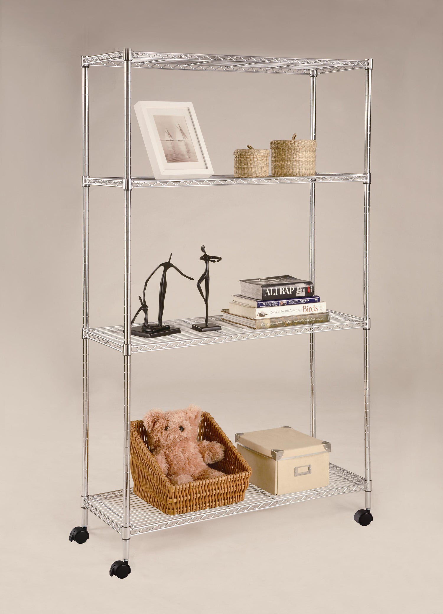 4 montanti e 4 ripiani in acciaio cromato. Completo di ruote. Dimensioni 90 x 35 x h 170 cm. Facile da montare