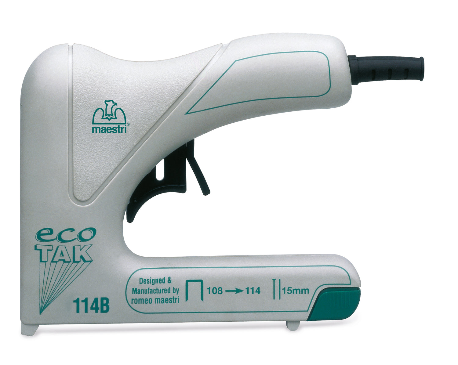 Mod. ECOTAK 114 B corpo in tecnopolimero antiurto a struttura rinforzata. Grilletto di sicurezza brevettato. Per punti con passo 11,2 mm e profondità 8÷14 mm Monta punti 114 e chiodini con e senza testa da 15 mm
