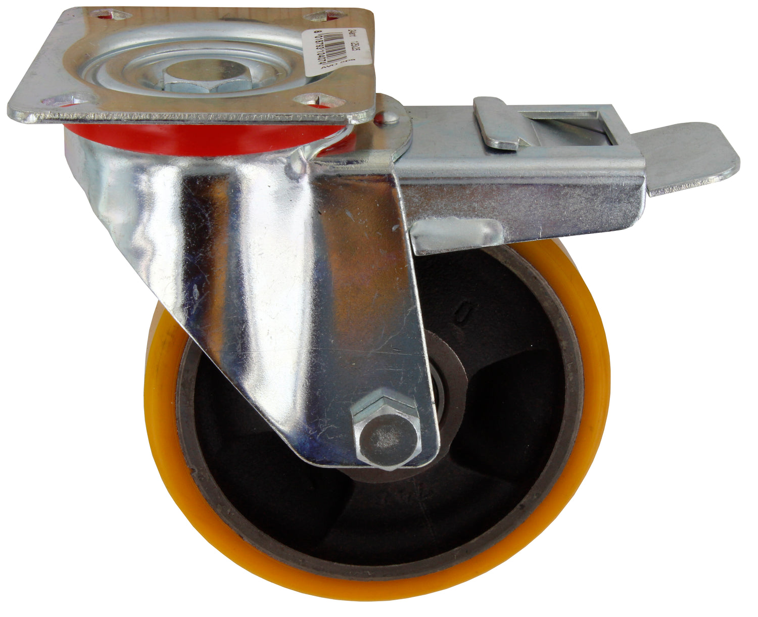 Art. 24/ANT rivestita in poliuretano Avolan Sh A 91. Nucleo in ghisa meccanica verniciata nero. Mozzo su cuscinetti a sfere schermati. Supporto in acciaio stampato con piastra girevole 100 x 85 mm. Con freno. Dimensioni ø 125 x 25 x h 155 mm. Portata max 170 kg.