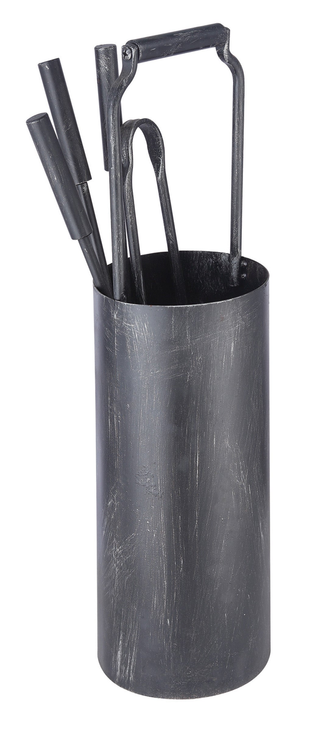 Mod. SECCHIELLO accessori per camino in acciaio, contenuti in uno stupendo contenitore cilindrico con all'interno: 1 spazzola, 1 paletta, 1 pinza e 1 attizzatoio. Il design ergonomico delle maniglie ne facilita il prelievo. Dimensioni ø 16 x h 58 cm. Colore nero.