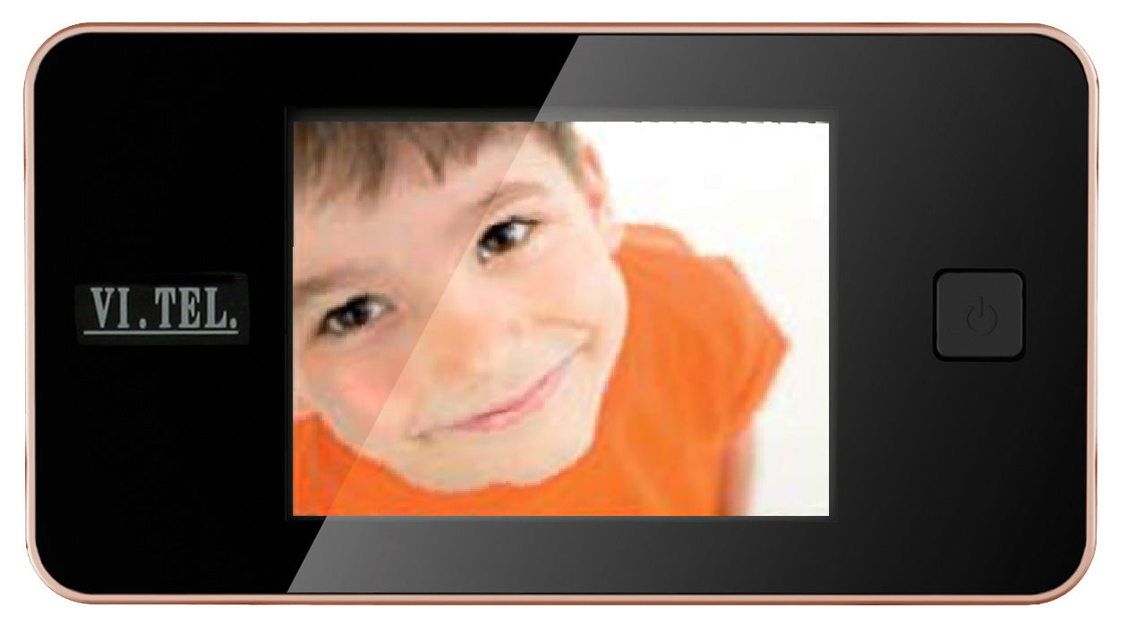Mod. E0372 Installabile su porte con spessore 38÷110 mm. Foro porta ø 14÷22 mm. Sensore CMOS 0,3 megapixel. Schermo LCD TFT da 3,2". Dimensioni 125 x 15 x h 68 mm. Attacco piattina FLAG. Angolo visuale 105°. Alimentazione 2 batterie stilo AAA. Accensione manuale. Spegnimento automatico dopo 10 secondi. Finitura oro.